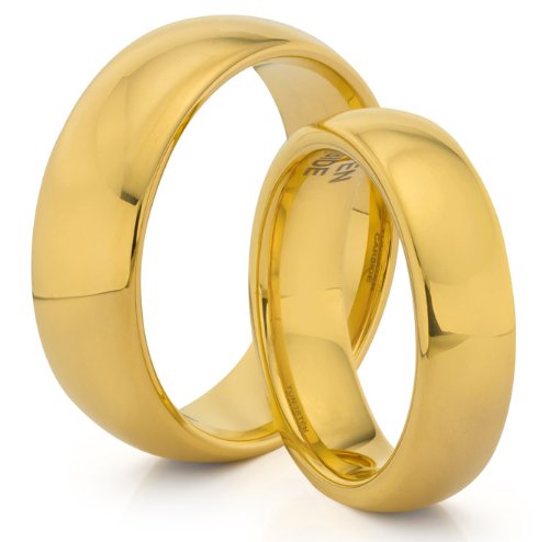 Our Classic gold wedding ring has the perfect brightly polished gold finish, using only the finest quality 14k gold plating, permanently bonded to our tungsten carbide. It is so very elegant in its simplicity, with its highly polished domed design and rounded edges. Truly an enduring piece. It features classic rounded edges and a comfort fit design.